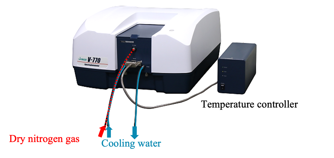 The absorption spectrum in the visible region also depends on the fraction of hydrogen bonds and by absorption in the near-infrared region, and may also be used to monitor changes in hydrogen bonding states with temperature. This is effective for solution samples whose near-infrared spectra are affected by dissolved components. The combination of a JASCO V-700 series spectrophotometer and a Peltier cell holder allows slight temperature-induced changes in absorption in the visible region to be detected for water, which is colorless and transparent to the naked eye.