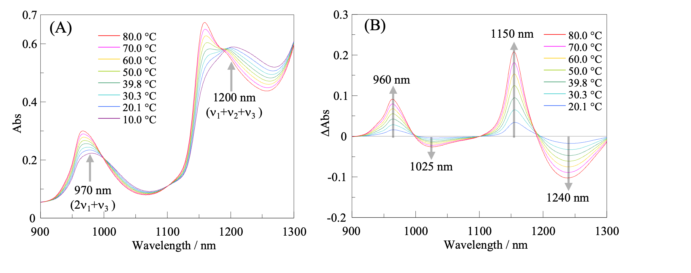 Absorption spectra of pure water in the near-infrared region at different temperatures are shown in Figure 2(A), and the difference spectra (relative to the spectrum at 10°C) for each temperature are shown in Figure 2(B). Absorption by water molecules in the near-infrared region is due to overtones and combination bands associated with v1 (symmetric stretching vibration), v2 (scissoring vibration), and v3 (asymmetric stretching vibration). The absorption observed at around 970 nm in Figure 2(A) is assigned to 2v1+ v3, and that at around 1200 nm to v1+ v2+ v3.4) As shown in Figure 2(B), as the temperature increases, the absorbance at around 960 nm and 1150 nm increases, while that at around 1025 nm and 1240 nm decreases. Absorption at around 1150 nm is known to originate from water molecules (S0) whose OH-group hydrogen atoms are not hydrogen bonded, absorption at around 1200 nm from water molecules (S1) with one OH-group hydrogen atom that is hydrogen bonded, and absorption at around 1250 nm from water molecules (S2) with two OH-group hydrogen atoms that are hydrogen bonded.4) In other words, with increasing temperature, there is a significant increase in the relative contribution ratio of S0 and a significant decrease in that of S2 relative to S1. These results are consistent with the reported hydrogen-bonding contribution ratios of S0:S1:S2 = 0.27:0.42:0.31 at 6°C and S0:S1:S2 = 0.40:0.42:0.18 at 72 °C.4)