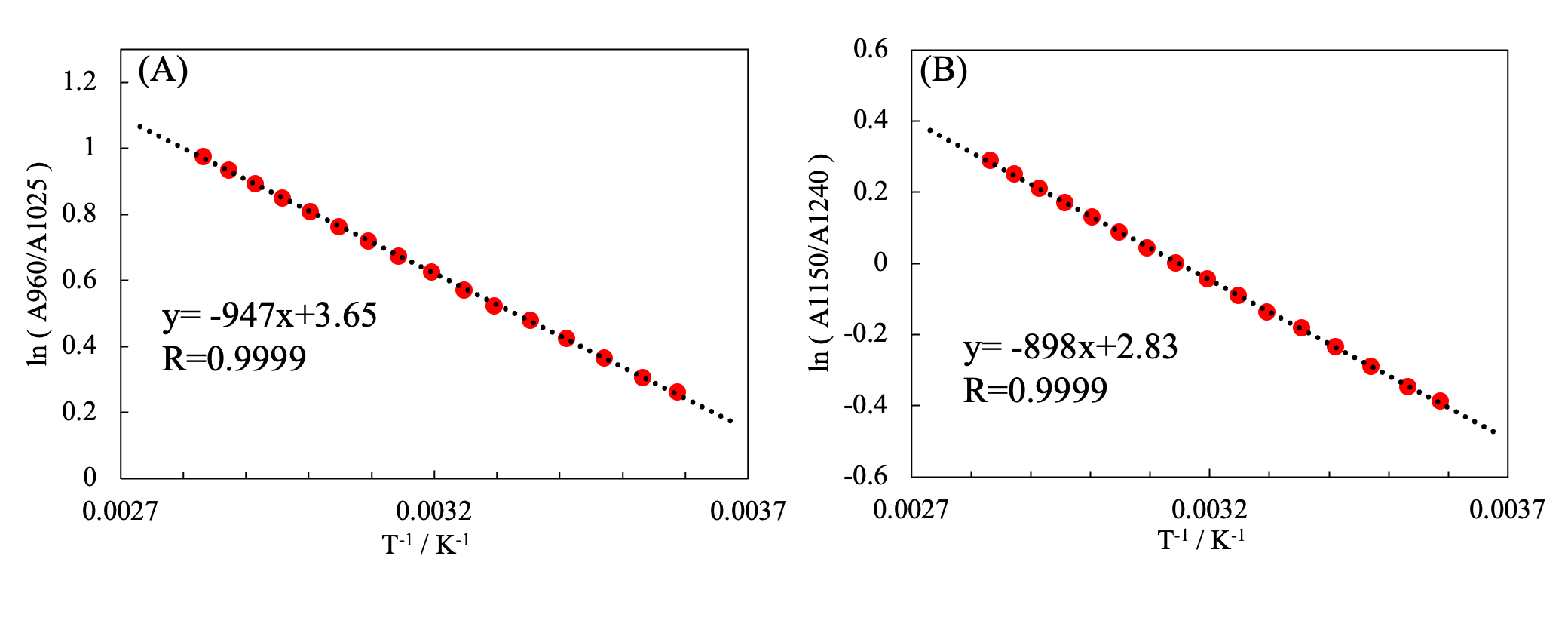 The cuvette effects were subtracted from the absorbance for each band. Then, the natural logarithm of the ratio of the absorbance of S0 to that of S2 was calculated. As in Figure 3, Figure 5 shows a plot with the ln(S0/S2) y-axis and the T-1 x-axis. The changes in the visible wavelength region are seen to be linear with respect to inverse temperature. This suggests that this change depends on the fraction of hydrogen bonds present.