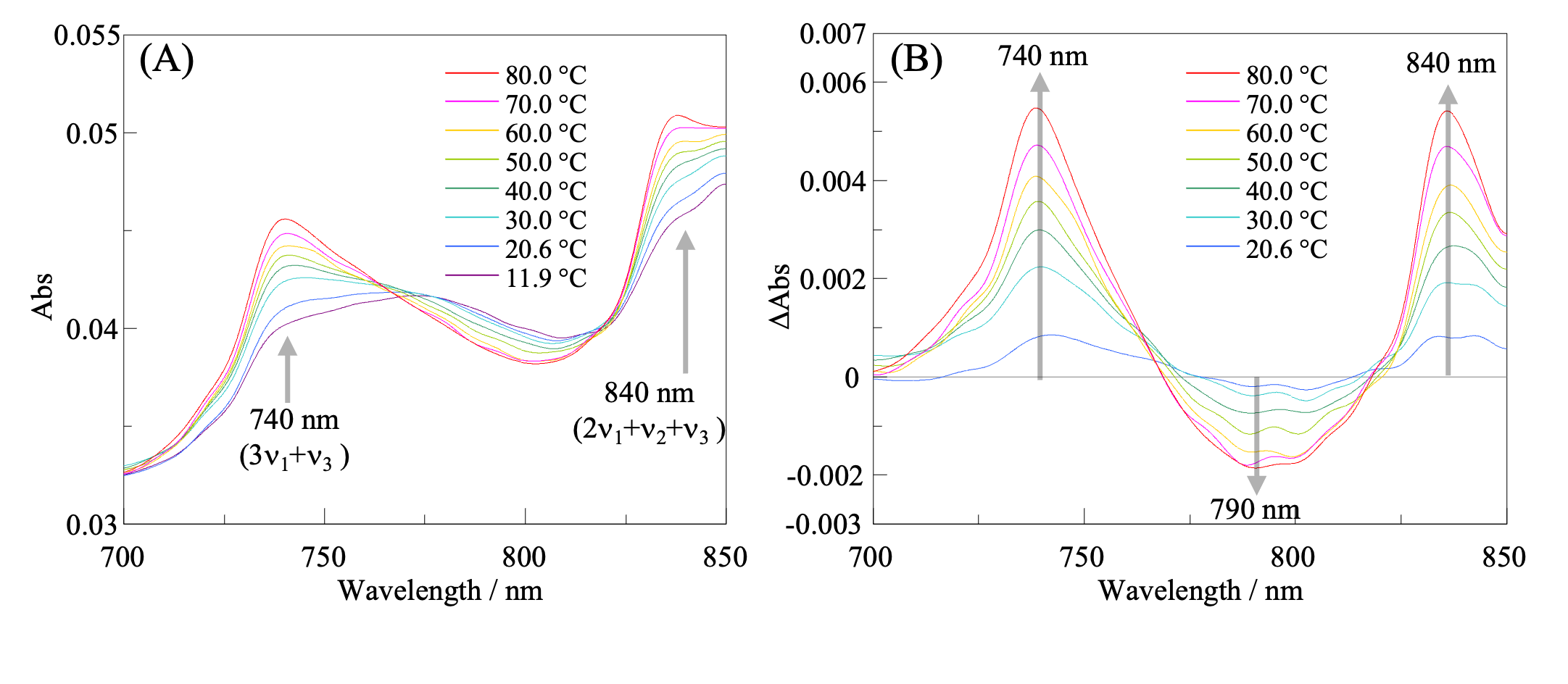In both figures, noise has been removed by FFT filtering. As in the case for the near-infrared spectra, the absorption at around 740 nm is thought to be associated with S0, and that at around 790 nm is thought to be associated with S2. Additionally, the absorption band at 740 nm is assigned to 3v1+ v3, and that at around 840 nm is assigned to 2v1+ v2+ v3.4) The absorption band at 790 nm is assigned to 3v1+ v3.