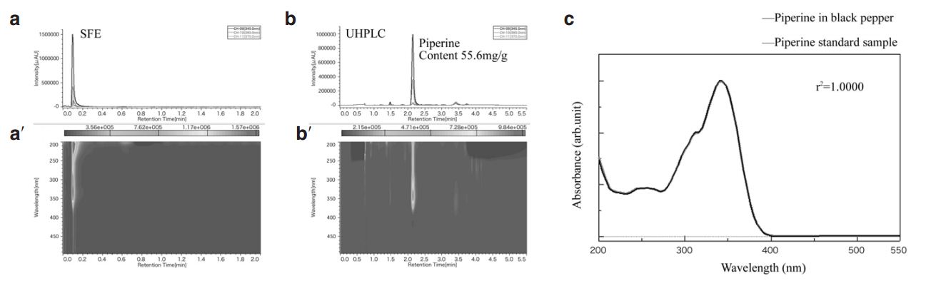 Figure 3 Sample: black pepper; a) SFE profiles at 345, 390, and 370 nm; a’) SFE profile contour plot; b) UHPLC chromatograms at 345, 390, and 370 nm; b’) UHPLC contour plot; and c) comparison of on-peak spectra of piperine standard and the peak in black pepper.