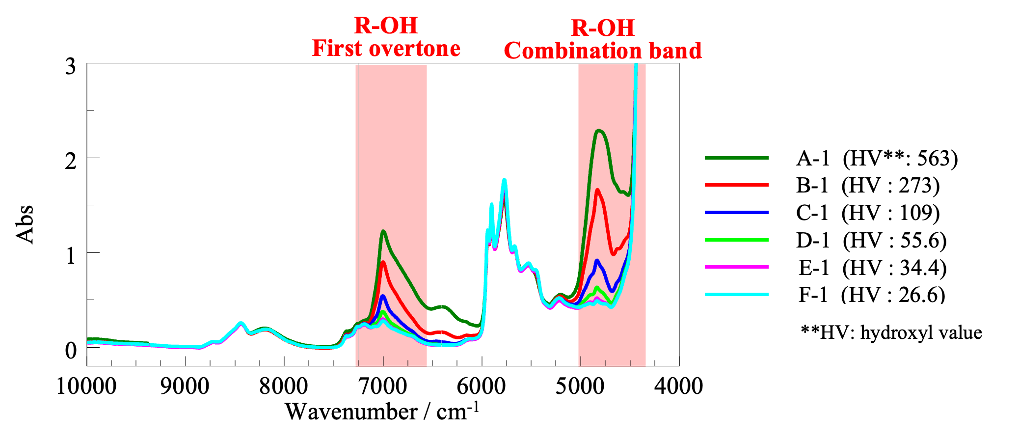 It was shown that the hydroxyl value for polyols could be accurately determined using a combination of near-infrared spectroscopy and multivariate analysis (PLS). The measurements could be performed for small sample volumes in a short time, in accordance with JIS K 1557-6. This is a powerful approach to quality control, quality testing and production process control environments for pharmaceuticals and food products, and not only for polymers.