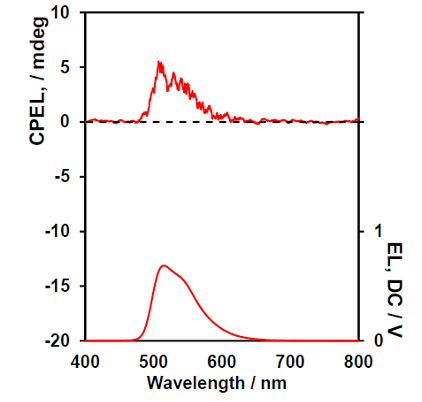 Figure 4 shows a photograph of the CP-OLED device under an applied voltage of 11 V. The device is seen to exhibit strong green light emission. The corresponding CPEL and EL spectra are shown in Figure 5. The EL spectrum has a peak wavelength of 514 nm and a positive CPEL signal is produced.