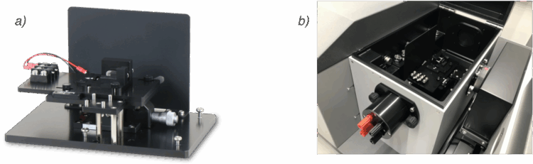 A CP-OLED emits circularly polarized luminescence (CPL) under an applied voltage and has potential applications in devices such as 3D displays and lights for plant growth.1 In this study, evaluation of the properties of CP-OLEDs is performed using a CPL measurement system with a dedicated accessory that allows easy alignment of the optical axis of the device and simple electrode wiring, so that stable measurement can be performed (Figure 1). In this report, we describe the use of this accessory to evaluate the CPEL properties of a CP-OLED device with fac-Λ-Ir(ppy)3 as an emitting layer.