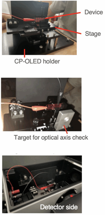 The CPEL and EL spectra of a CP-OLED device with fac-Λ-Ir(ppy)₃ as the emitting layer and an emission area of 2 x 2 mm were measured using a dedicated CP-OLED accessory. This accessory allows easy alignment of the optical axis of the device and simplifies electrode wiring, so that stable CPEL measurements can be performed.