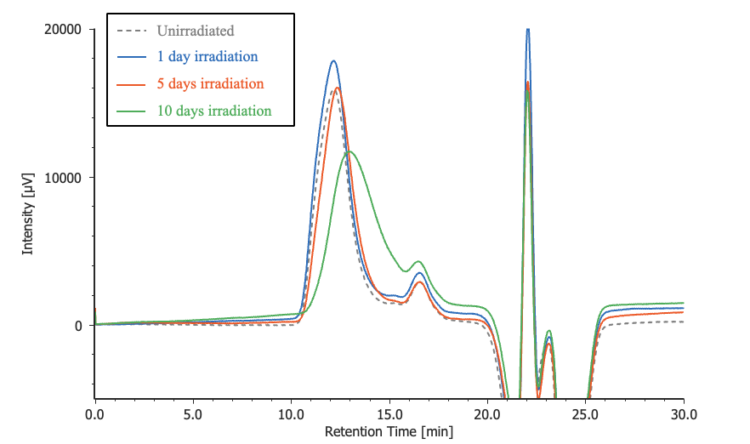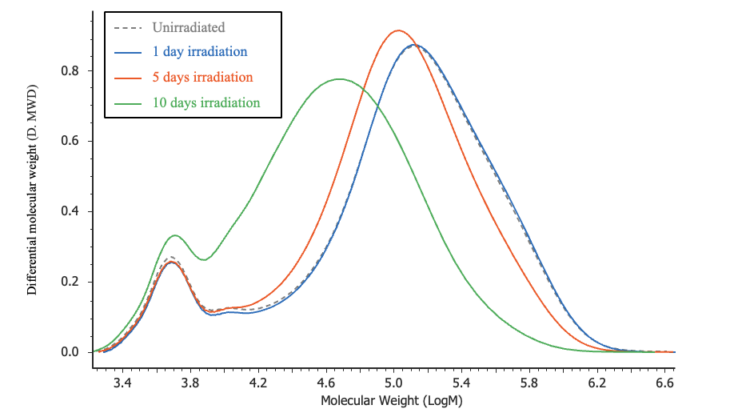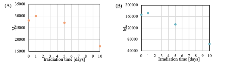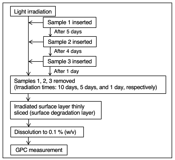 Following irradiation, the degraded surface of each sample was removed using a plane-type slicer (Slice Master KS-10, provided by JASCO Engineering Co., Ltd.). The collected material were dissolved in the mobile phase at a concentration of 0.1% (w/v) and analyzed by GPC.