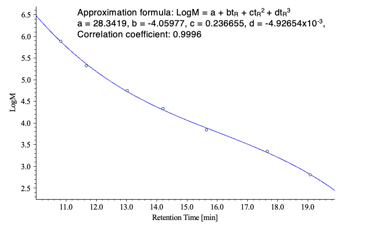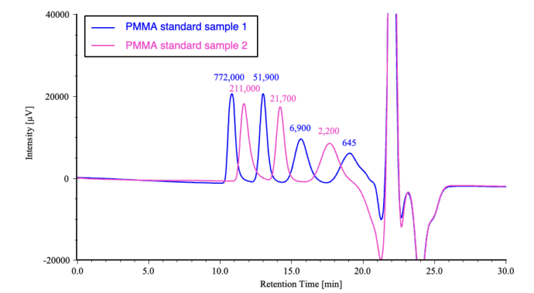 Figure 3 shows chromatograms obtained for two PMMA standard samples, and Figure 4 shows the corresponding calibration curve.