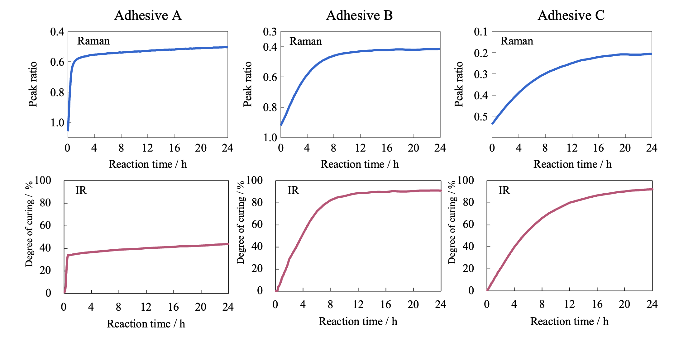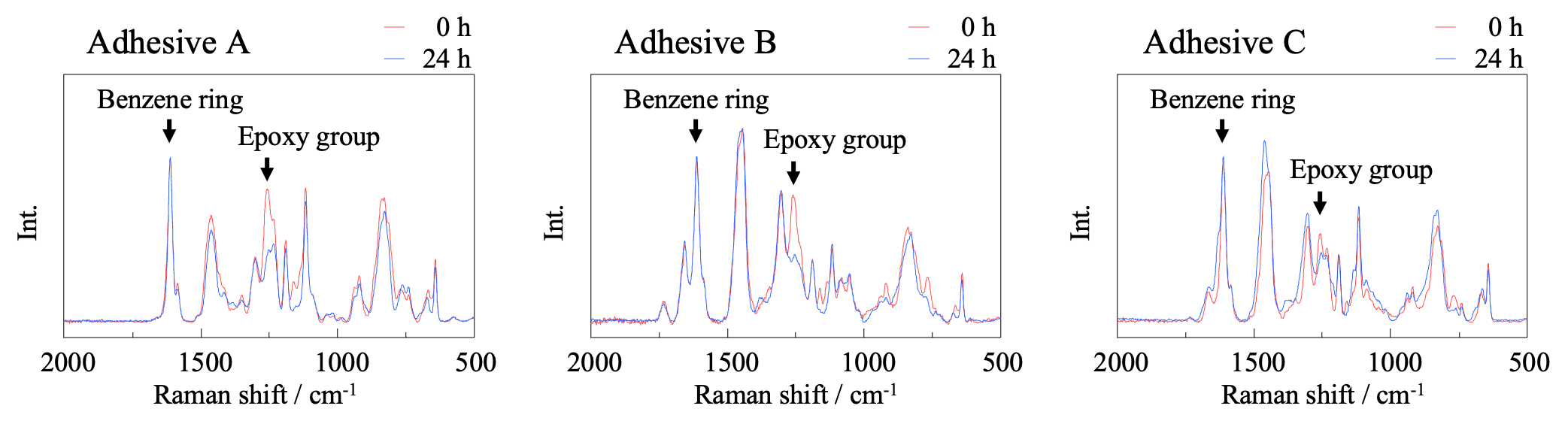 The decrease in the number of epoxy groups due to curing of the adhesive (Figure 3, upper panels) is similar to the change in the degree of curing determined using IR spectroscopy (Figure 3, lower panels). This indicates that the degree of curing can be successfully monitored using the JASCO palmtop Raman spectrometer. As can be seen, even for continuous measurements for 24 hours, the reaction process could be monitored stably without any drift or other effects.