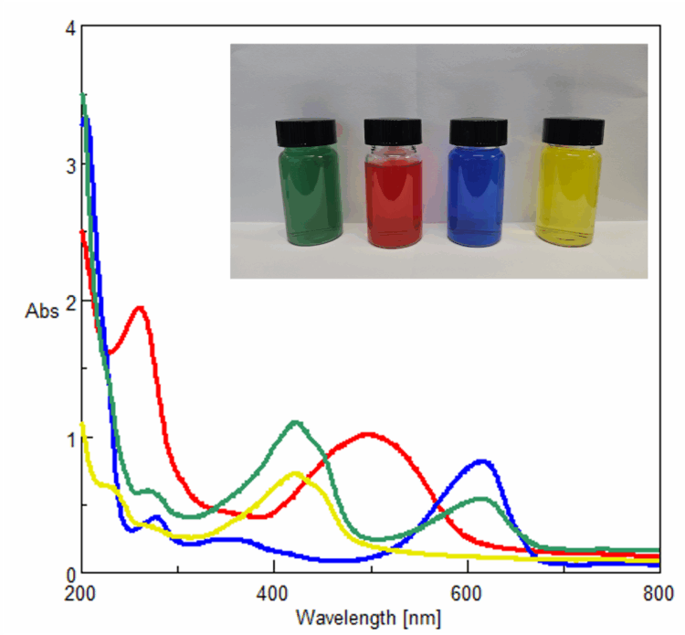 Four commercially-available natural colorants were used to make four stock solutions in ultrapure water. Each stock was measured in a 10 mm cuvette using a UV-Vis spectrometer, and these spectra were used to create a library for color matching.