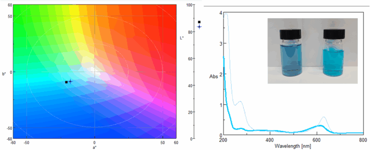 On a L*a*b* color space the predicted color of the color match solution is depicted as a crosshair and the sports drink color is depicted as a square (Figure 3a). The ΔE*ab between the two colors was calculated as 4.58. Preparing the solution as recommended yielded the natural colorant mimic which has the spectrum in Figure 3b (thick line) and is compared to the spectrum of the light blue sports drink (thin line). Note the peak broadness of the natural colorant vs. the thin line of the synthetic pigment. In the Figure 3b inset the natural colorant (left) is seen to be slightly darker than that of the sports drink (right).