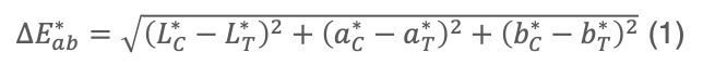 where c is the calculated value, T is the target color, and L*, a*, and b* are calculated color values.