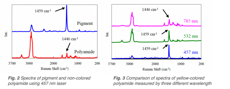 As reference, uncolored polyamide pellets and a pure pigment sample were first measured using a 457 nm excitation (Fig. 2). In both cases, well-defined spectra were obtained, and the spectral profiles were clearly distinct. The polyamide spectrum exhibited prominent bands attributable to hydrocarbon vibrations in the 3000-2800 cm-1 region and at 1446 cm-1, whereas the pigment spectrum showed a strong peak at 1459 cm-1.