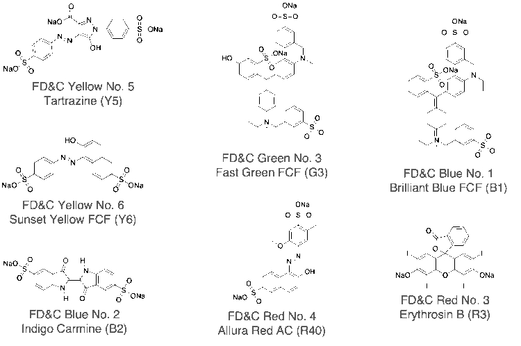 Seven synthetic dyes that are commonly used in foods and beverages were used as standards.