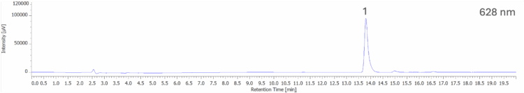 For the blue sports drink, the peak corresponding to Brilliant Blue FCF (B1) in the chromatogram at 254 nm, Figure 7A, was difficult to quantify due to poor resolution caused by an overlapping peak; however, extracting the chromatogram at the λmax of B1 (628 nm), shown in Figure 10, isolates the peak for accurate quantification.