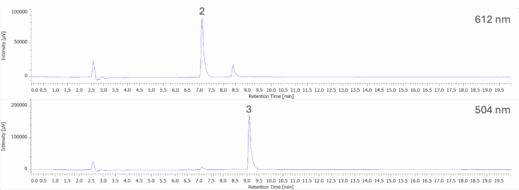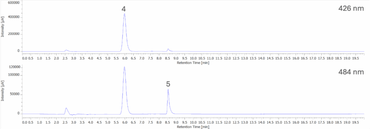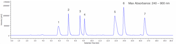 A maximum absorbance chromatogram displays the highest absorbance value recorded at each time point across the specified wavelength range and is useful for providing a clear overview of all chromophoric components in a sample, regardless of their wavelength. Figure 4 shows the maximum absorbance chromatogram from 240 – 900 nm of the 50 µg/mL standard solution.