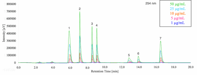 The five standard solutions were analyzed under the HPLC conditions listed in the experimental section producing the five overlaid chromatograms shown in Figure 2.