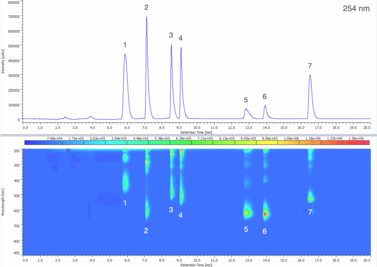 Table 1 shows the λmax and correlation coefficient for each synthetic dye calibration curve. Figure 6 shows the seven λmax extracted chromatograms from the 50 µg/mL standard solution.