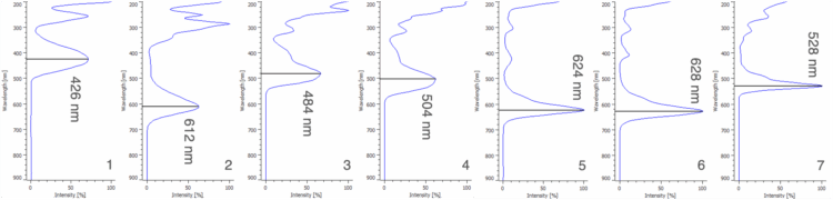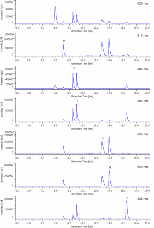 Figure 5 shows the corresponding peak-top spectrum from 200 – 900 nm of each peak in Figure 4. The spectra of the 7 components in the 50 µg/mL standard solution were registered in a spectral library, which will be used later for the identification of synthetic dyes in three unknown samples.