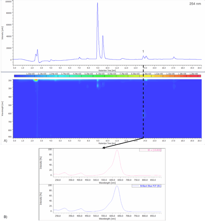 Figure 7A shows the chromatogram at 254 nm and PDA contour plot from 200 – 900 nm for an unknown blue sports drink. Figure 7B shows the peak-top spectrum of peak 1 from Figure 7A and the spectral library search result when compared to a spectral library containing the seven reference spectra obtained from the 50 µg/mL standard solution in Figure 5. Peak 1 shows a strong match to Brilliant Blue FCF (B1), with a correlation coefficient of 0.999167.