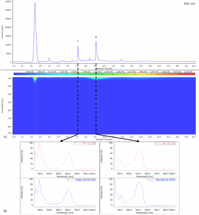 Figure 8A shows the chromatogram at 254 nm and PDA contour plot from 200 – 900 nm for an unknown purple gelatin dessert. Figure 8B shows the on-peak spectra of peaks 1 and 2 and their spectral library search result when compared to a spectral library containing the seven reference spectra obtained from the 50 µg/mL standard solution in Figure 5. Peak 1 shows a strong match to Indigo Carmine (B2), with a correlation coefficient of 0.999741. Peak 2 shows a strong match to Allura Red AC (R40) with a correlation coefficient of 0.998700.
