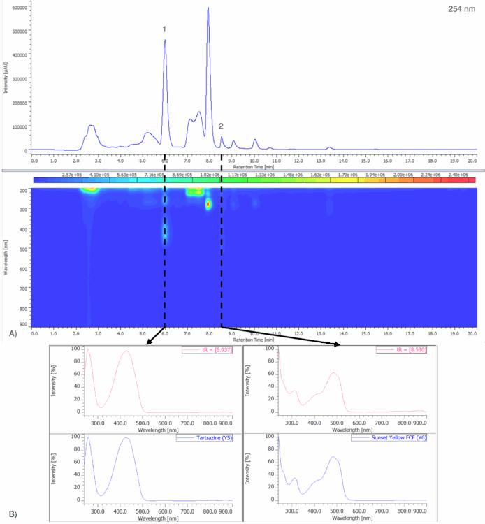 Figure 9A shows the chromatogram at 254 nm and PDA contour plot from 200 – 900 nm for an unknown yellow freeze pop. Figure 9B shows the peak-top spectra of peaks 1 and 2 and the spectral library search results when compared to a spectral library containing the seven reference spectra obtained from the 50 µg/mL standard solution in Figure 5. Peak 1 shows a strong match to Tartrazine (Y5), with a correlation coefficient of 0.999842. Peak 2 shows a strong match to Sunset Yellow FCF (Y6), with a correlation coefficient of 0.995832.