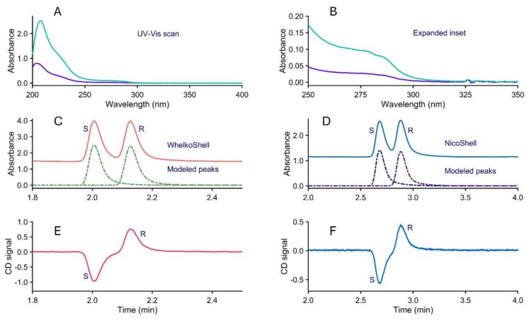 For analytical purposes, two chiral column chemistries with broad selectivity for various classes of molecules were investigated based on the functional groups present in the molecules. A column chemistry that separated the tianeptine enantiomers was the WhelkoShell chemistry (Figure 2C). This stationary phase is usually recommended for normal phase mode; however, herein we demonstrate that polar ionic mode (using neat methanol with additives) also works on the WhelkoShell. The bonded chiral selector is an (S, S)-configured 1-(3,5-dinitrobenzamido)-1,2,3,4-tetrahydrophenanthrene, whose cleft-shaped pocket is crucial for enantioselectivity. The second column chemistry is the NicoShell, a proprietary macrocyclic glycopeptide5 bonded to superficially porous silica particles, which exhibits good selectivity for basic compounds. Because tianeptine contains ionizable functionalities (a secondary amine and a carboxylic acid) and can engage in hydrogen bonding, its enantiomers were resolved on a NicoShell column under polar ionic conditions in the presence of acetic acid and ammonium hydroxide as mobile phase modifiers, as shown in Figure 2D. Since the CD detector cell volume is 40 μL, the extra-column effect slightly lowers the resolution; however, the goal was to confirm the opposite directions (positive and negative peaks) of CD signals for tianeptine standards (Figure 2E–F). This resolution compromise with a large cell is no longer a problem because peak modeling can readily extract the true peak profile, even if there is mild overlap.8 The CD detector confirms that separate column chemistries and different eluent systems yield the same elution order of tianeptine enantiomers. Further analytical work was done on the NicoShell column in polar ionic mode.