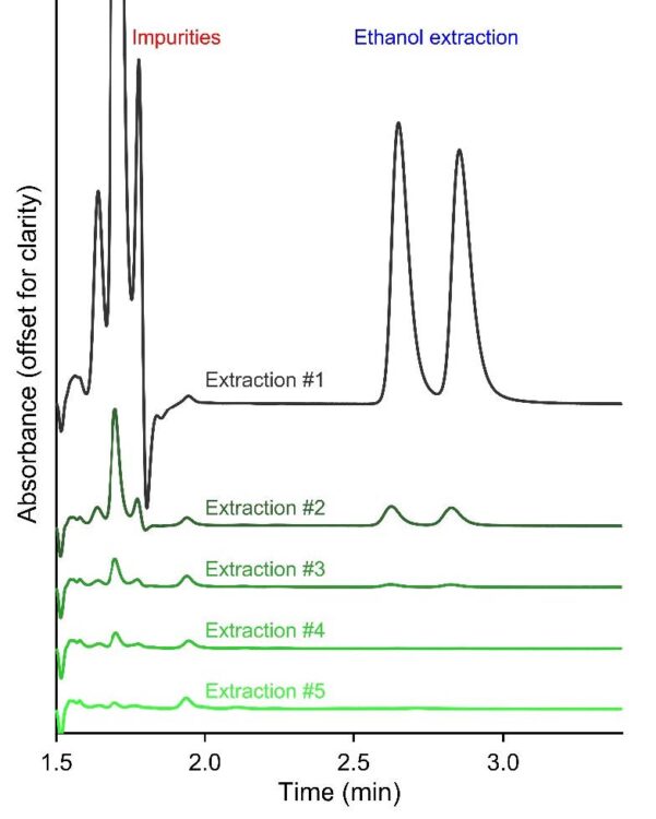 For the solid product, about 30 mg of the capsule contents was transferred into a 1.5 mL Eppendorf tube. The sample was extracted five times by adding 1 mL of ethanol, sonicating for 30 seconds, centrifuging at 13,000 rpm for 5 minutes, and carefully decanting the supernatant each time. The reason for choosing the 5-step extraction becomes clear in Figure 3, where three extractions are sufficient, but to ensure completion, five extractions are conducted. The combined extracts were then concentrated by rotary evaporation at 25 °C, and the residue was brought up to 1 mL with ethanol in Class A 1 mL volumetric flasks. After filtration, the solution was injected into the HPLC. For the liquid product, a nominal 300 μL was pipetted into a vial and weighed. Then, 2 mL of ethanol was added, and the mixture was shaken and filtered through a 0.22 μm syringe filter. The filter was washed with 1 mL of ethanol, which was discarded after filtration, and 3 mL of ethanol, which was retained after filtration. The vial was also rinsed with ethanol, which was kept. The final rinses were to ensure all the tianeptine was quantitatively transferred. The filtrate and the collected ethanol were mixed and then rotary evaporated to reduce the volume. The volume was adjusted to 1 mL using ethanol in a Class A volumetric flask.