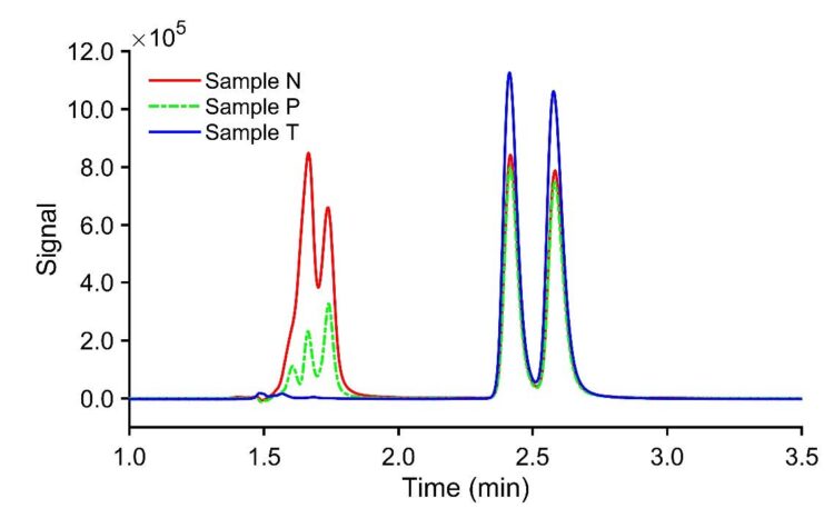 Unregulated samples from vendors exhibited a racemic composition of tianeptine after ethanol extraction, as confirmed by RHPLC analysis on the JASCO system, as shown in Figure 5. Sample N was a syrupy liquid, and samples P and T were powders inside tablets. The range of total tianeptine in these products was found to be 49 – 55 mg per tablet, and the liquid bottle contained approximately 110 mg of total tianeptine. In enantiomeric analysis, one can perform total area calibration as shown in this application note. From the chiral analysis, we can assess the enantiomeric ratios. This technique enables the rapid determination of the fractional mass of each enantiomer when needed.