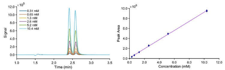 For quantitative purposes, tianeptine standards were prepared in a range that bracketed the expected concentration of the sample solutions (0.3 to 10 mM). The absorption maximum of tianeptine is at 210 nm. Unfortunately, most organic compounds and solvents will start absorbing at this wavelength, so we selected the 220 nm channel from the PDA data. Higher concentrations, such as 15 or 20 mM tianeptine at 210 nm, started to show non-linearity in the calibration curve. Deviations from linearity arise fundamentally in an absorbance–concentration calibration curve whenever one or more of the Beer–Lambert law’s underlying assumptions break down. At elevated concentrations, the sample itself begins to attenuate the incident beam so strongly that the light intensity reaching deeper layers is substantially reduced. This “inner-filter” phenomenon causes the apparent absorption per unit concentration to drop off, resulting in a concave-downward calibration curve. With PDA data, any wavelength as shown in the UV spectra can be conveniently selected. Figure 4 shows the overlaid chromatograms, as well as the linear region of the calibration curve at 220 nm, with six standards, yielding an R2 value of 0.9995 and an equation Peak Area = 915190.04 C + 96754.26, where C is the concentration of total tianeptine stereoisomers in mM.