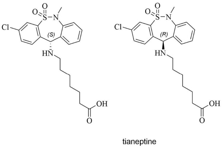 Depression ranks among the most widespread neurobiological disorders globally, manifesting as persistent difficulties with focus, tiredness, increased anxiety, and consistently low mood. The combination of its widespread impact on health and the absence of a definitive cure has driven extensive pharmacological research and drug-discovery initiatives. Tricyclic antidepressants, such as imipramine, amitriptyline, and protriptyline, demonstrate considerable efficacy in alleviating depressive syndromes, but their use is constrained by marked cardiovascular toxicity. Decades ago, tianeptine was proposed by researchers as a new tricyclic antidepressant with distinctive structural features, a dibenzo-[c,f][1,2]thiazepine S, S-dioxide scaffold, and an aminoheptanoic acid side chain. This structure resulted in mitigating the negative side effects of classical antidepressants.1 Tianeptine has a short half-life and is rapidly eliminated from the body with minimal to no adverse cardiovascular effects; however, there are other safety concerns.1-3 The molecular structure of tianeptine (C21H25ClN2O4S) is shown in Figure 1, and the presence of one chiral carbon leads to a single pair of R/S stereoisomers. Typically, it is sold as a sodium salt.