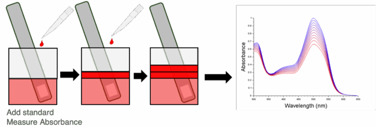The effects of other components in solution, referred to as matrix effects, can lead to lower or higher absorbance at the wavelength of interest. A way to combat this is to add known amounts of standard directly into an unknown solution thereby accounting for matrix effects (standard addition). Often the total volume is kept constant with different concentrations of standard, but standard addition can also be performed by adding increasing amounts of standard to the same unknown solution (cumulative standard addition). Using a fiber optic dip probe placed into an unknown solution, quantitation can even be performed without opening the UV-Vis sample compartment or swapping cuvettes.