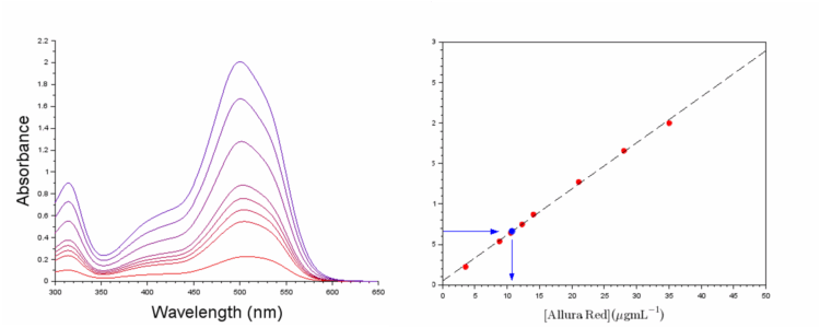 Fig. 5 a) UV-Visible Spectra of Allura Red standards b) the Absorbance at 500 nm plotted against concentration