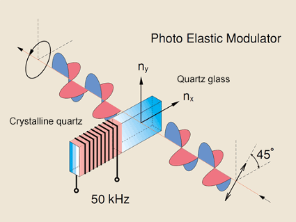 In a circular dichroism spectrophotometer, linearly polarized light is created to later produce circularly polarized light. Non-polarized light first passes through a polarizer in which the crystal axes and the orientation of the molecules are aligned. A photo-elastic modulator (PEM) is then used to convert the linearly polarized light into circularly polarized light. As seen in Figure 3, the PEM is a piezo-elastic element, cemented to a block of fused quartz. When a 50 kHz frequency is applied to the piezo-elastic element, it stresses the quartz piece, inducing birefringence and two polarization components. Circular polarization occurs when the phase of an orthogonal electric field deviates by 1/4 wavelength.