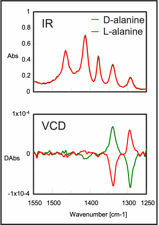 The main application for VCD instrumentation is the absolute configuration of chiral organic molecules. Analysis usually starts with the simulation of infrared spectrum using the dipole moment of molecules, or enthalpy energy of bonds. Then calculated VCD spectrum optimized based on the molecular structure, after VCD spectrum is measured, calculated and measured VCD spectra are compared and configuration is determined .
