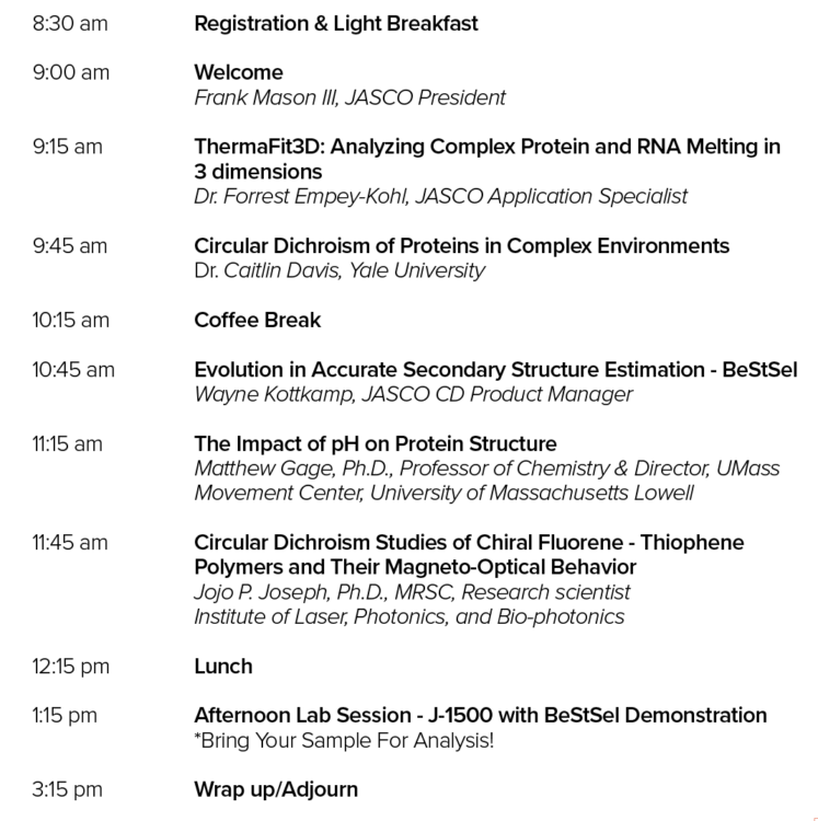 *If you are interested in bringing a sample for analysis, please request our sample submission form at [email protected]. Current CD owners who would like to analyze your data with the BeStSel secondary structure estimation method are welcome to bring samples as well. We will get to as many as we can during the time allotted.